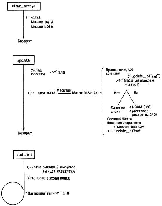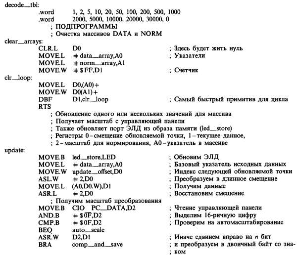 Подпрограмма clear__arrays заполняет нулями оба массива DATA и NORM; массив DISPLAY очищать нет необходимости, потому что программа update сразу же скопирует нули из DATA в DISPLAY. Эта программа обновляет за раз одно значение из массива DISPLAY, используя для этого текущие параметры изображения с управляющей панели и входные данные из массивов DATA и NORM; она также обновляет состояние порта ЭЛД, копируя байт памяти led__store.