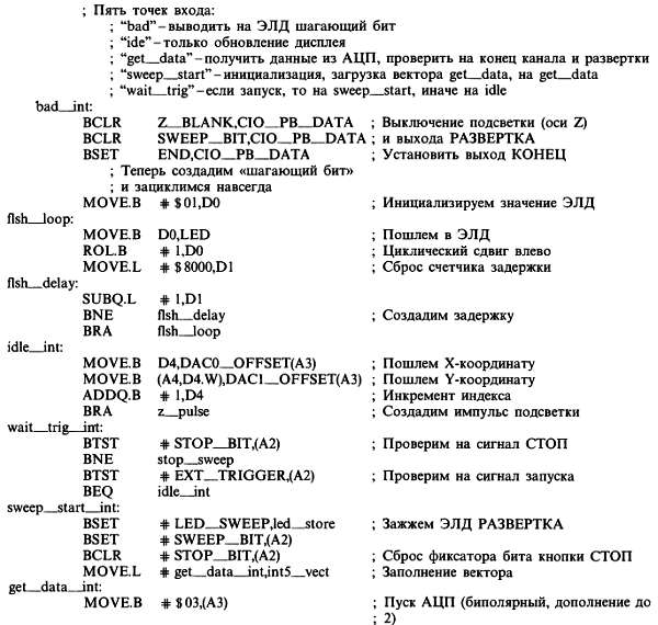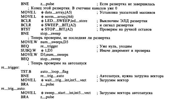Наконец, вход wait__trig служит для проверки наличия сигнала внешнего запуска и перехода либо на sweep__strat, либо на idle. В обработчике прерываний имеются и другие метки (например z__pulse), но они не являются входными точками, а служат для переходов внутри программы.
