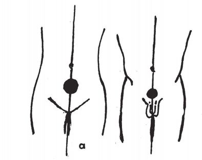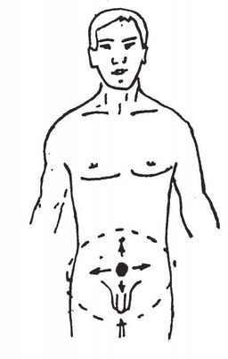 Открытие ключа на родниках Силы по своему принципу одинаково на всех центрах. Разберем его более подробно на центре Чрево. Как уже говорилось, физиологически он совместим с предстательной железой у мужчин и маткой у женщин. Точка родника находится в центре тела, как показано на рис. 14а — у женщин и на рис. 14б — у мужчин. Соответственно, генерировать движение нужно именно этой точкой-родником, а не просто крутиться и вращаться в пояснице.
