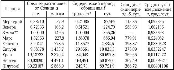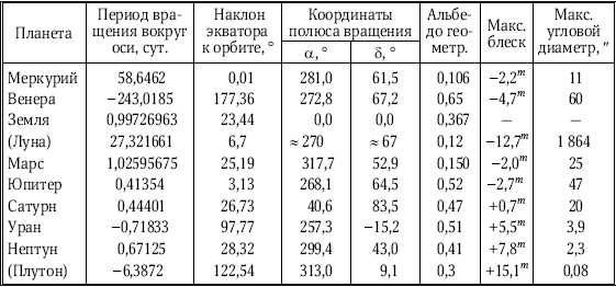 Примечание: параметры сидерического вращения вокруг оси указаны на 0,0 января 2001 г. Периоды указаны в сутках длительностью 86 400 с СИ. Для Юпитера и Сатурна указан период вращения в системе III (связанной с магнитным полем). Знак периода указывает направление вращения. Блеск и угловой диаметр планет даны для наблюдателя на Земле. Блеск верхних планет (Марс – Плутон) указан в их среднюю оппозицию.