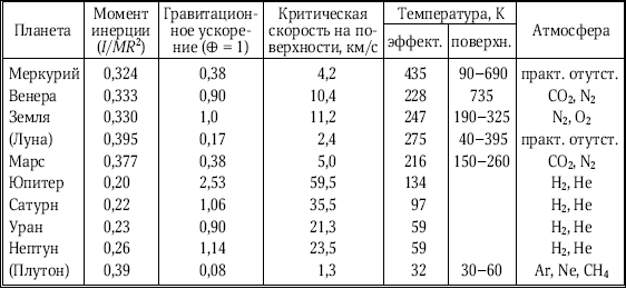 Примечание: гравитационное ускорение на поверхности равно GM/R2e. Критическая (вторая космическая) скорость дана на уровне твердой поверхности или (для газовых гигантов) на уровне атмосферного давления 1 бар и без учета сопротивления атмосферы.