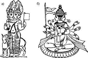 а) Бог Агни. Деревянная фигура. Юж. Индия, б) Редкое изображение Агни, семь его рук — семь языков огня, три ноги — три сферы проявления его энергии, два лица — всеохватность огня