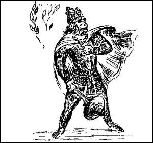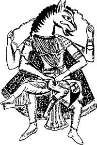 Изображений Агни в современной Индии почти нет. Мне, во всяком случае, их видеть не приходилось. Но он описывается в древних памятниках литературы как существо с семью языками, со знаменем из дыма и пламенеющим копьем. Говорится, что он был рожден в колеснице, влекомой четырьмя красными конями и имеющей колеса, в которых спицы из семи ветров Этот образ идентифицируется с небесным огнем — Солнцем. Говорится, что у него была жена по имени Сваха и три сына, от которых родилось еще 45 сыновей. Самого же Агни называют сыном Брахмы — бога давнего и практически народом Индии почти забытого.