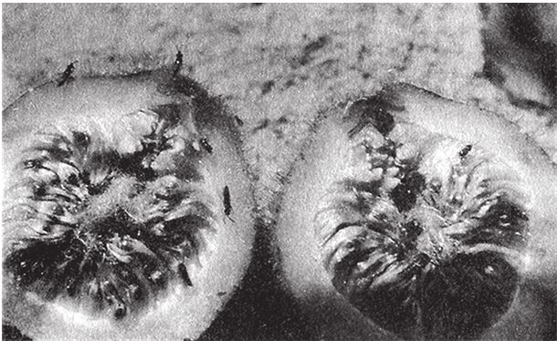 Рис. 10.5. На разрезе фиги видны самки наездников, размахивающие своими “бурами”-яйцекладами.