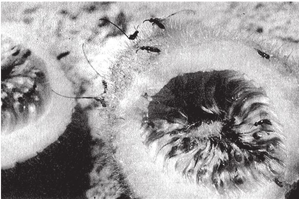 Жизнь бластофаг представляет собой цикл – не знаешь, с чего и начать их жизнеописание. Но делать нечего – начну с того момента, когда в глубине запертого сада вылупляются личинки, по одной в каждой крохотной капсуле у корешков женских цветков. Поедая зреющие семена, они развиваются во взрослых особей, прогрызают свои капсулы и получают относительную свободу передвижения по темной камере плода. Далее жизненные пути самцов и самок расходятся. Самцы появляются на “свет” первыми и принимаются шарить по фиге в поисках капсул неродившихся самок. Обнаружив такую капсулу, самец прогрызает стенку яйца и спаривается с еще не родившейся “невестой”. После этого самка выходит из своего яйца и сама отправляется гулять по миниатюрному висячему саду. Детали тех событий, которые происходит дальше, зависят от конкретного вида наездников, но есть и моменты, типичные для всех инжирных наездников. Самка ищет мужские цветки – и чаще всего находит их у выхода из фиги. Она усердно трудится в потемках и при помощи специальных щеточек на передних лапках набивает пыльцой кармашки, расположенные во впадинах на грудке.