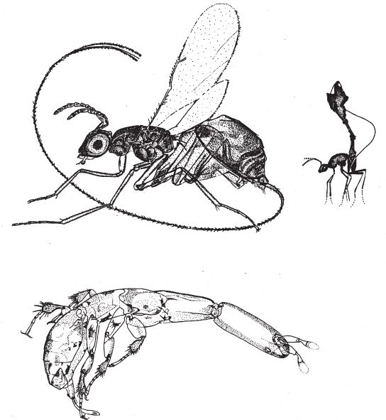 Рис. 10.6. Захребетники: наездники Apocrypta perplexa не опыляют фиги, но используют их для своих нужд. (а) самка; (b) уменьшенное изображение самки с яйцекладом наготове; (с) бескрылый самец вовсе не похож на наездника.