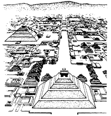 Теотуанакан (реконструкция). Вид на Дорогу Мертвых из-за пирамиды Луны. Слева от Дороги — пирамида Солнца. Вдали посередине комплекса Цитадели находится Храм — пирамида Кецалькоатля