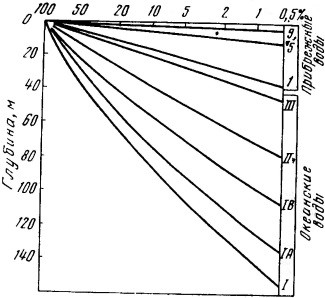 Рис. 32. Ослабление нисходящего светового потока с глубиной в водах различных типов (% от падающего на поверхность)