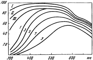 Рис. 33. Спектральные кривые пропускания (% на 1 м) исходящего светового потока водами различных типов