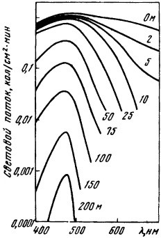 Рис. 34. Спектральное распределение света на разных глубинах в самых чистых океанских водах
