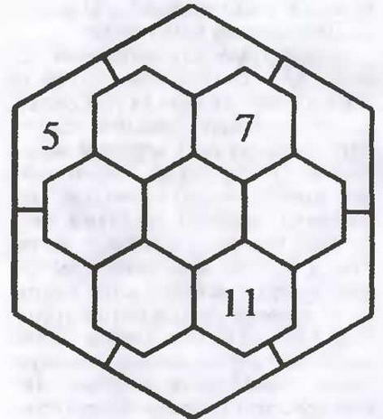 Числовые соты:Тринадцать областей на рисунке необходимо заполнить числами от 1 до 13 (три из них уже показаны) таким образом, чтобы числа в соседних областях отличались между собой не менее, чем на 2 (1 и 3 в соседних областях располагать нельзя, а 1 и 4 можно).