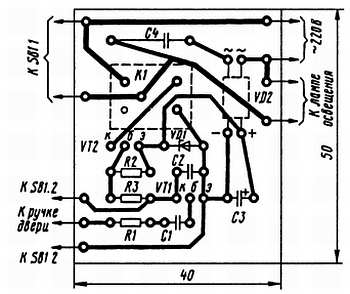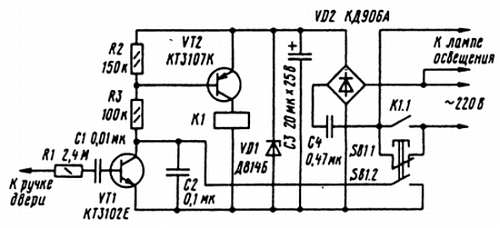 Если же закрывать дверь с внутренней стороны, прикосновение к ручке двери приведет к отпиранию транзистора, его коллекторный ток создаст падение напряжения на резисторе, которым откроется транзистор VT2. В результате сработает реле и контактами К1.1 заблокирует контакты дверного переключателя SB 1.1. Осветительная лампа будет продолжать гореть. Когда дверь закроется, контакты SB 1.1 разомкнутся, a SB1.2 замкнутся, благодаря чему окажется накоротко замкнут транзистор VT1. Через резистор R2 все еще будет протекать ток, отпирающий транзистор VT2, и реле останется сработавшим, контактами К1.1 поддерживая горение осветительной лампы после того, как ручка двери будет отпущена.