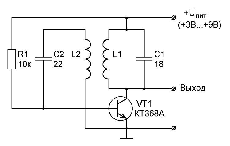 В непосредственной индуктивной связи с катушкой L1 контура находится катушка L2, которая подключена, соответственно, в цепь базы транзистора VT1. Положение рабочей точки транзистора определяется величиной сопротивления резистора R1, через который положительное напряжение от источника питания подается на базу транзистора.