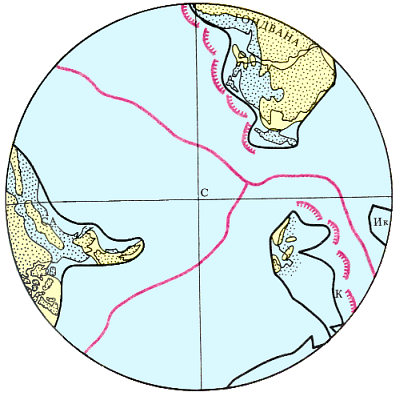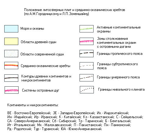 1 — моря и океаны; 2 — области древней суши; 2 — области современной суши; 4 — срединно-океанические хребты; 5 — контуры древних континентов и микроконтинентов; 6 — системы островных дуг; 7 — активные континентальные окраины; 8 — зоны столкновения континентальных окраин с островными дугами; 9 — границы тропического пояса; 10 — границы субтропического пояса; 11 — границы умеренного пояса; 12 — границы нивального климата. Континенты и микроконтиненты — BE-Восточно-Европейский; ЗЕ — Западно-Европейский; Ик — Индокитайский; Ир — Иранский; К — Китайский; Кз — Казахский; С — Сейшельский; СА — Северо-Американский; Сб — Сибирский; Тр — Таримский; Б — Бенгальский; Ит — Итальянский; Мк — Малокавказский; П- Пакистанский; Пн — Паннонский; Рд — Родопский; Тур — Туранский; ЮА — Южно-Американский.