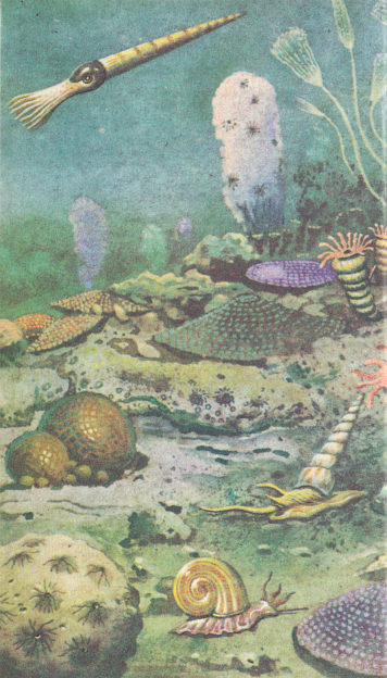 В ордовике и силуре среди беспозвоночных ведущая роль принадлежала наутилоидеям. Они обладали прямой огромной многокамерной раковиной, вели активный придонный образ жизни и были хищниками. Размеры их раковин составляли 2–3 м.