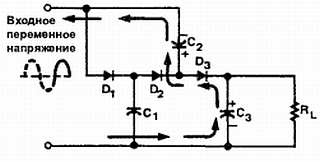 В течение этого полупериода на конденсаторе С2 создается разность потенциалов, которая в три раза больше максимального входного значения. Верхняя обкладка конденсатора С2 заряжена положительно до удвоенного максимального значения напряжения. Анод диода D2 имеет положительный потенциал, равный утроенному значению максимального значения напряжения по отношению к земле, следовательно, конденсатор С3 заряжен до утроенного значения максимального значения напряжения. Это напряжение и прикладывается к нагрузке.