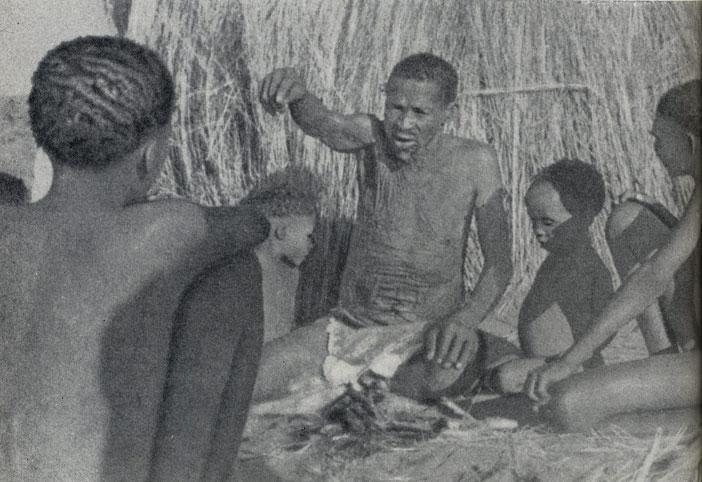 Мы провели несколько дней с бушменской общиной, которая живет в травяных хижинах среди дюн поблизости от дома служащего парка Калахари-Гемсбок. Наше посещение внесло заметное оживление в унылое однообразие их жизни (обычно они сидят и коротают тягучее время). Мы оделили их табаком, показали фотографии других бушменов, а когда включили магнитофон и прослушали песни, записанные в Самангейгее, их радости не было конца. Познакомившись с ними поближе, мы записали их песни и сказки. Главой общины был Магай, умный старик, полный чувства собственного достоинства. Этот любивший пошутить мудрец не мог примириться с пассивным существованием. Часто в его глазах появлялось отсутствующее выражение: он размышлял о прошлом и с тревогой думал о будущем своей маленькой общины.