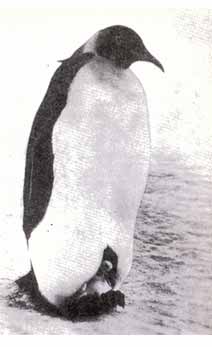Императорские пингвины тоже выкармливают своих птенцов кашицеобразным веществом, которое вырабатывается у них в стенках пищевода и желудка. Эти странные пингвины выводят птенцов не весной, а в разгар антарктической зимы. Бушуют снежные бури. Мороз обжигает, как огонь: шутка сказать – минус 80 градусов! А пингвины сидят на яйцах. Вернее – стоят: единственное свое яйцо держат на лапах, прикрыв его сверху, как пуховым одеялом, складкой кожи на брюхе. Положить-то ведь его некуда: кругом снег.