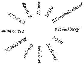 В одном из номеров «Журнала Невоспроизводимых Результатов» («The Journal of Irreproducible Results», 9, 1960) предложена следующая схема расположения фамилий авторов статьи, исключающая возможность выделения кого-нибудь одного из авторов и нанесения обиды остальным: