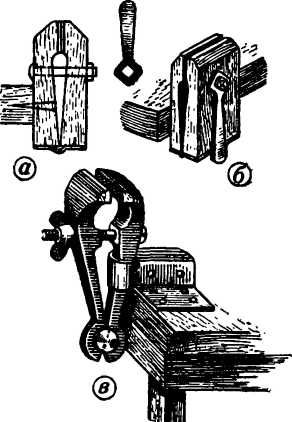 Рис. 69. Самодельные настольные тиски: а, б — деревянные тиски без разжимной пружины; в — приспособление ручных тисков в качестве настольных.