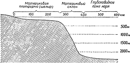 Но наиболее интересно для геологов, что вблизи материков и многих крупных островов дно моря представляет собой полого опускающуюся равнину, которая идёт от берега примерно до глубины в 200 метров, а потом заканчивается относительно крутым склоном, падающим до многокилометровых глубин. Эту равнину начали называть материковой платформой или шельфом (по-английски — ступень), а круто наклонённую часть дна — материковым склоном.