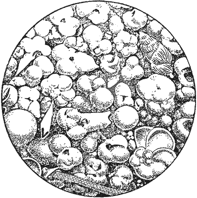 Множество таких животных имеет скорлупки (раковины) из извести, пронизанные дырочками. Поэтому их так и называют дырочниками или, по-латыни, фораминиферами. В донных отложениях чаще всего встречаются фораминиферы, называемые глобигеринами (рис. 5). На больших пространствах их бывает так много, что илы и пески называют там глобигериновыми (рис. 6).