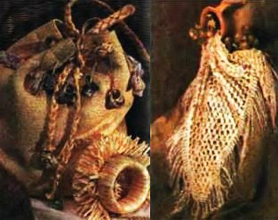 Детали донышка втачайте в концы боковых частей сумки. Выверните налицо, открытый участок зашейте. Прокладку приутюжьте к обеим боковинкам. По верхнему краю сумки ?робейте блочки с одинаковыми интервалами. Из «лубяных» волокон сплетите косу. Концы ее туго обмотайте отрезком пряжи. Проденьте косу в блочки. Ручки сплетите длиной около 135–140 см. Концы ручек пришейте с внутренней стороны. Как видно из рисунка, сумка украшена ракушками.