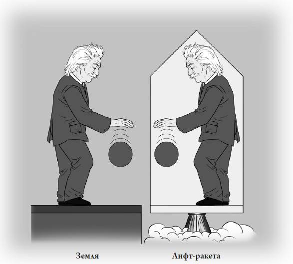 Рис. 2.3. Принцип эквивалентности Эйнштейна: гравитация и ускорение производят одинаковые силы, и ни один эксперимент не может отличить их друг от друга