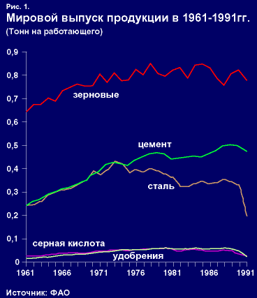 Если мы просто будем иметь в виду такого рода аналитические соображения, доступные статистические показатели ООН и родственных ей организаций за период 1963–1993 гг. расскажут нам неопровержимую историю. В течение этого периода выработка продукции материального производства снизилась во всем мире в расчете на единицу рабочей силы сельского и городского населения, взятого вместе. Тот факт, что некоторые регионы мира являются исключением из этого правила, не меняет глобальной картины (см. Рис. 1).