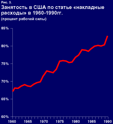 Из этого следует выделить один важный момент: опасность огромных, превышающих разумные пределы масштабов административной занятости. Сочетание неоправданно растущих затрат, связанных с торговлей и администрированием, с ростом избыточной занятости в сомнительно расширяемой сфере так называемых «услуг», являет собой инфляционное экономическое расстройство, которое сродни поражению раковыми метастазами жизненных процессов. Это заболевание может, в конечном счете, довести до смерти народное хозяйство, точно так же, как оно медленно, но верно убивает американскую экономику в течение последних 40 неразумных лет постепенного дрейфа в постиндустриальный утопизм.