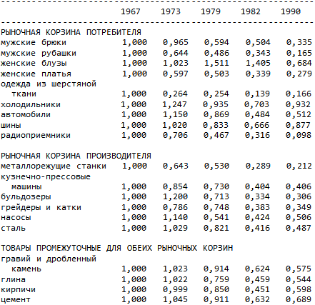 Таблица 2. Уровни производства для товаров производственной и потребительской рыночных корзин в расчете на 1 домохозяйство (уровень производства в 1967 г. принят за 1,000)