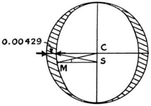 … Меня заинтересовало, почему и каким образом появился серп именно такой вот толщины (0.00429). В то время, как мысль эта кружила в моей голове, в то время, как я вновь и вновь понимал… что моя кажущаяся победа над Марсом была именно кажущейся, совершенно случайно, до меня дошло, что секанс (секанс угла М равен отношению MC:MS) угла 5? 18' является мерой самого крупного оптического уравнения. Когда я понял, что секанс этот равняется 1.00429, я почувствовал, будто бы пробудился ото сна…