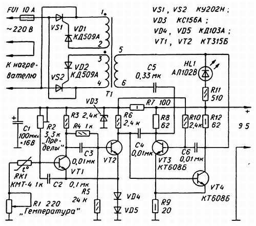 Для сужения петли гистерезиса в эмиттерную цепь транзисторов включены диоды VD4, VD5. Пределы регулирования температуры устанавливают резистором R2, а значение температуры — резистором R1. При мощности нагревателя более 200 Вт тринисторы нужно снабдить радиаторами.