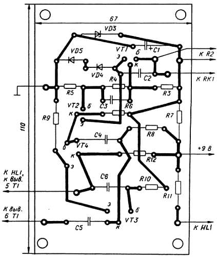 Трансформатор Т1 намотан на ферритовом кольце марки 2000НМ размерами 18x12x4 мм. Его одинаковые обмотки содержат по 50 витков провода ПЭЛШО 0,17. Печатная плата с расположением деталей показана на рис. 33.