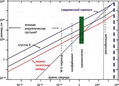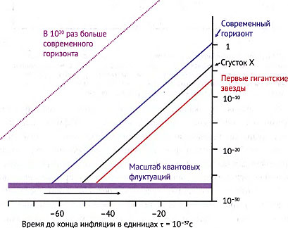 Прямая линия, пересекающая весь рисунок, — размер горизонта. При инфляции практически все флуктуации плотности, кроме самых последних, очень быстро растягиваются за пределы горизонта и таким образом «замораживаются». Возмущение не может эволюционировать, когда оно распределено по множеству причинно не связанных областей. После инфляции расширение становится медленней роста горизонта, и флуктуации вновь входят под горизонт — сначала те, что поменьше, потом большего размера. Скорость роста масштабов увеличивается на отметке времени 80 тыс. лет и приводит к формированию наблюдаемой структуры уже в возрасте вселенной во многие миллионы и миллиарды лет — в довольно узкой полосе в масштабе рисунка. Об этом более подробно рассказано в следующей главе.