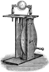 Вот отворяется дверь, ведущая во внутренние помещения Грешем-колледжа, и два оператора вносят какой-то станок, похожий на ножное точило. Такая же станина, большое колесо с ручкой, а наверху вместо точильного камня прилажен стеклянный шар, из которого выкачан воздух. Следом за установкой появляется и ее изобретатель Фрэнсис Гауксби – демонстратор, подготавливающий опыты для очередных заседаний. После смерти Гука он занял его место, вступив в должность одновременно с новым президентом.