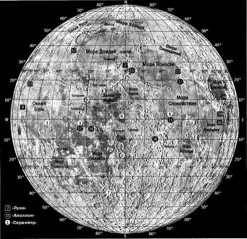 Рис. 6.138. Места прилунения пилотируемых и беспилотных аппаратов.