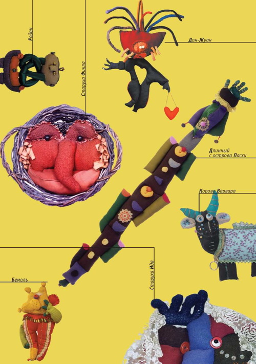 А все они — ассоциативные образы птиц, животных, людей, а то и просто текстильные скульптуры, выражающие сиюминутное настроение Хозяйки, той самой, что тоже поселилась в сундуке.
