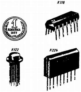 Это микросхемы серий К118, К122 и К224. Аналогично выглядят микросхемы широкого применения многих других серий. Рядом для сравнения изображена копеечная монета, дающая представление о размерах микросхем этих серий. Масса первой из этих микросхем 1 г, второй 1,5 г, третьей 3 г.