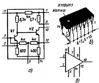 Рис. 295. Схема (а), конструкция (б) и условное обозначение (в) микросхемы K118УH1