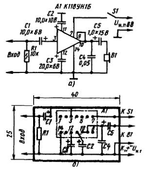 В любом из этих устройств, о которых я здесь рассказал, можно также использовать микросхему К118УН1А или, увеличив напряжение источника питания до 12 В, микросхему К118УН1В. В первом случае уровень сигнала на выходе усилителя, генератора или приемника будет несколько слабее, а во втором — несколько сильнее. При этом никаких изменений в монтаже делать не надо.