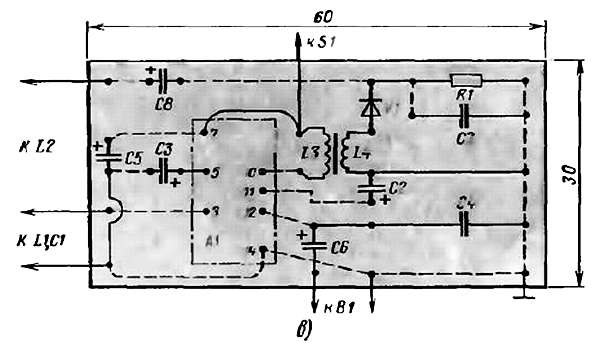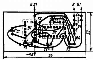Переменный резистор R1 с выключателем мигания S1, находящийся за пределами платы, может быть любого типа (ТК, СП-3), постоянные резисторы —. MЛT. Все электролитические конденсаторы типа К50-6, остальные конденсаторы — МБМ, БМ-2, КЛС. Динамическая головка В1 мощностью 2–3 Вт, например 2ГД-28, 3ГД-38 со звуковой катушкой сопротивлением 4,5–6,5 Ом.