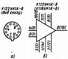 Рис. 299. Цоколевка (а) и нумерация выводов (б) микросхем К122УН1А-К122УН1В