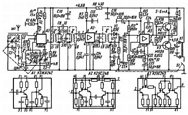 В приемнике, как видишь, использованы три микросхемы: К2ЖА242 (А1), К2УС248 (А2) и К2УС245 (АЗ). Первая из них, содержащая два транзисторных каскада, работает в преобразователе частоты с отдельным гетеродином, вторая — в двухкаскадном усилителе ПЧ (транзисторы второго каскада включены по так называемой каскодной схеме), третья — в пятикаскадном предварительном усилителе напряжения звуковой частоты (транзисторы первого и третьего каскадов включены по схеме эмиттерного повторителя, остальные — по схеме ОЭ). В выходном двухтактном бестрансформаторном усилителе мощности работают низкочастотные маломощные германиевые транзисторы структур n-p-n (V2) и p-n-p (V3). Выходная мощность приемника около 150 мВт, промежуточная частота 465 кГц.