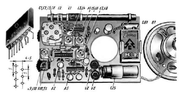 Все детали приемника, кроме динамической головки, можно смонтировать на одной общей печатной пласте с внешними размерами 130х80 мм, выполненной из фольгированного стеклотекстолита или гетинакса толщиной 2 мм. Головку В1 типа 0.5ГД-21, определяющую размеры приемника, крепят непосредственно к лицевой стенке корпуса.
