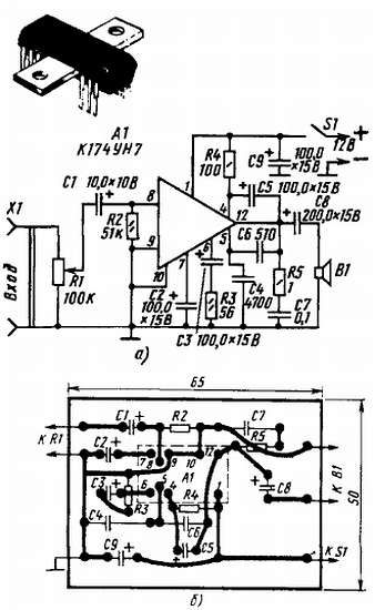 Микросхему вместе с дополнительными деталями можно смонтировать на плате размерами 65х50 мм (рис. 302, б).