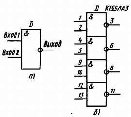 Рис. 303. Логический элемент 2И-НЕ (а) и микросхема 155ЛАЗ (б)