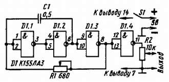 Во всех устройствах, о которых я рассказал тебе в этой части беседы, микросхему К155ЛА3 можно заменить микросхемой К133ЛА3 из серии К133 или К158ЛА3 из серии К158. При этом никаких изменений в схеме делать не надо, так как эти микросхемы как и К155ЛА3, содержат по четыре элемента 2И-НЕ с таким же расположением выводов.