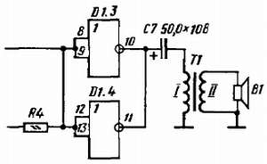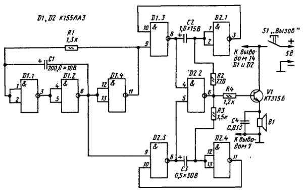 Принцип работы всех генераторов аналогичен действию предыдущих, но частота пульсаций первого генератора составляет 0,7–0,8 Гц, частота второго около 600 Гц, третьего примерно 1000 Гц. Частота импульсов первого генератора, выполняющего функцию электронного переключателя, определяется в основном емкостью конденсатора С1, а частоты второго и третьего генераторов, являющихся тональными, емкостями соответствующих им конденсаторов С2 и С3 и резисторов R2 и R3. Когда нажата вызывная кнопка S1 и, следовательно, подано напряжение питания на микросхемы, импульсы переключающего генератора включают (со сдвигом фазы на 180°) тональные генераторы. При этом на выводе 6 элемента D2.2 периодически, с частотой переключающего генератора, появляются колебания то второго, то третьего тональных генераторов. Эти колебания усиливаются транзистором V1 и динамической головкой В1 преобразуются в как бы переливающийся и изменяющий свою тональность звук. Резистор R4 ограничивает ток базы транзистора V1.