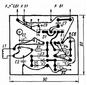 В твоем распоряжении может не оказаться именно тех деталей, под которые рассчитана печатая плата приемника. Поэтому подобранные и проверенные детали размести в рекомендуемом порядке на листе бумаги и с учетом их конструкций и габаритных размеров произведи соответствующую корректировку печатных проводников платы. Если нет фольгированного материала, соединения деталей на плате, изготовленной из листового гетинакса или текстолита такой же толщины, делай отрезками монтажного провода.